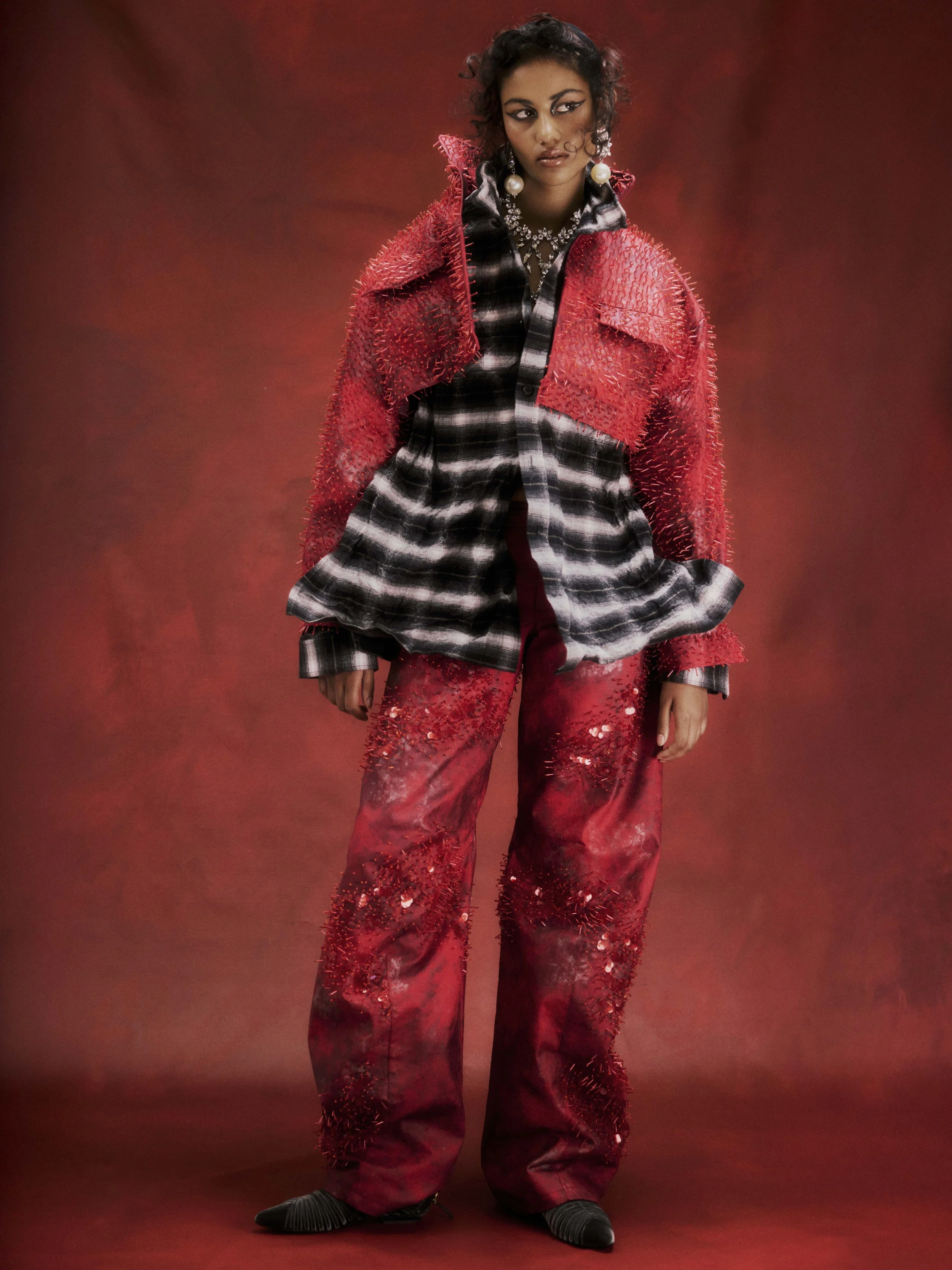 Red jacket: Erik Yvon, Red trousers: Erik Yvon, Check shirt : Glenn martens H&M, Shoes: Giorgio Armani, Earrings & necklace: House of Emmanuele, Bralette: Vollek