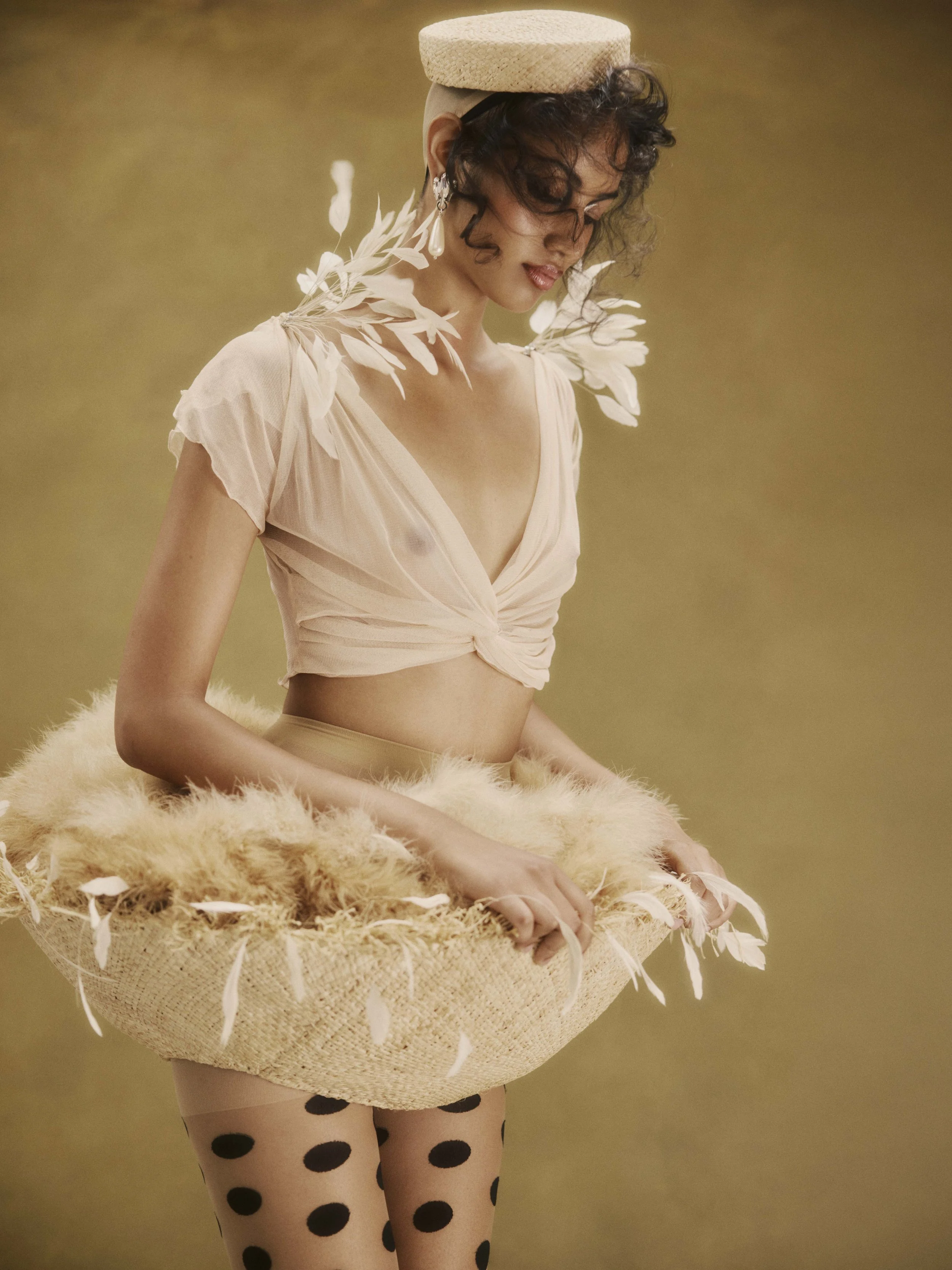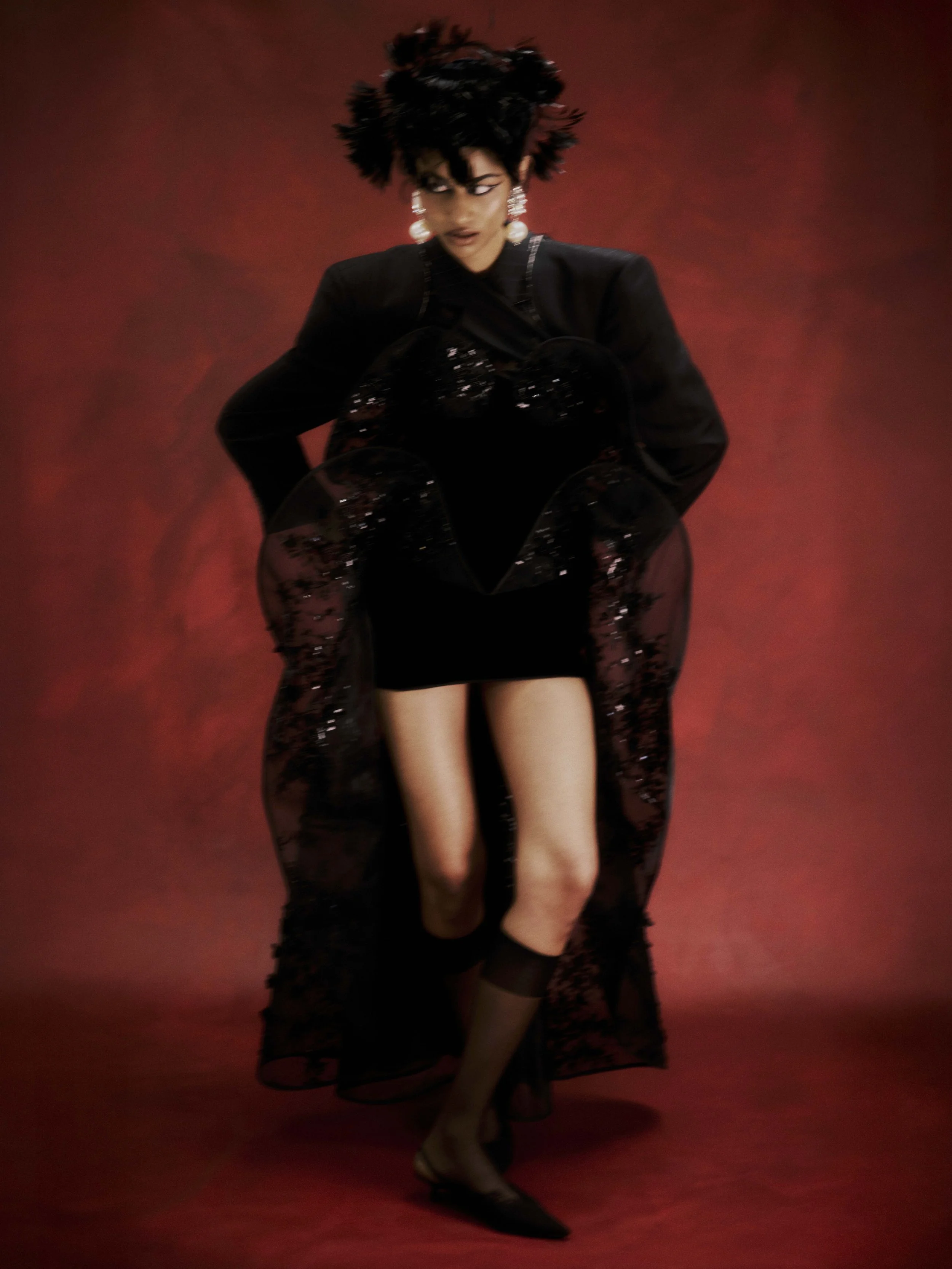Blue shirt: Kourh, Black top & wings: Haluminous, Sheer skirt: Gail Sorronda, Socks: stylists own, Shoes: Pelle shoes, Earrings: House of Emmanuele